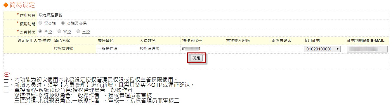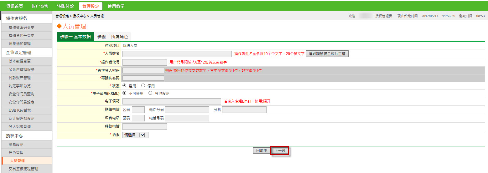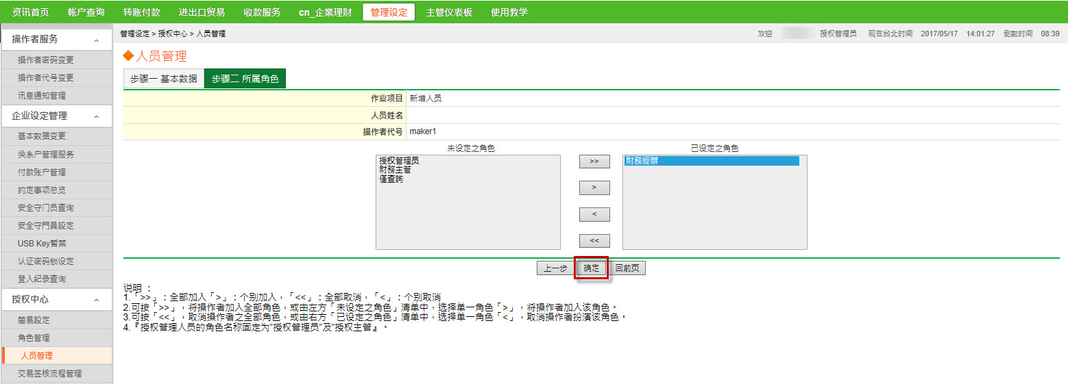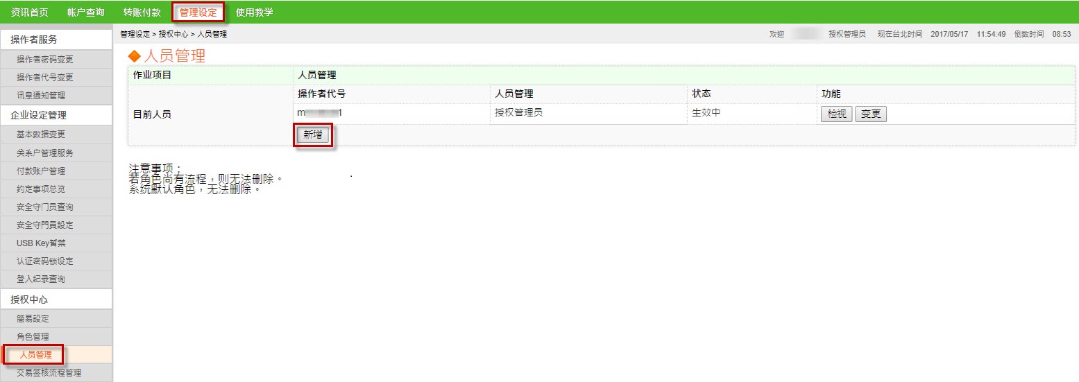 点选【管理设定】→点选【人员管理】,新增其他使用者→勾选【新增】