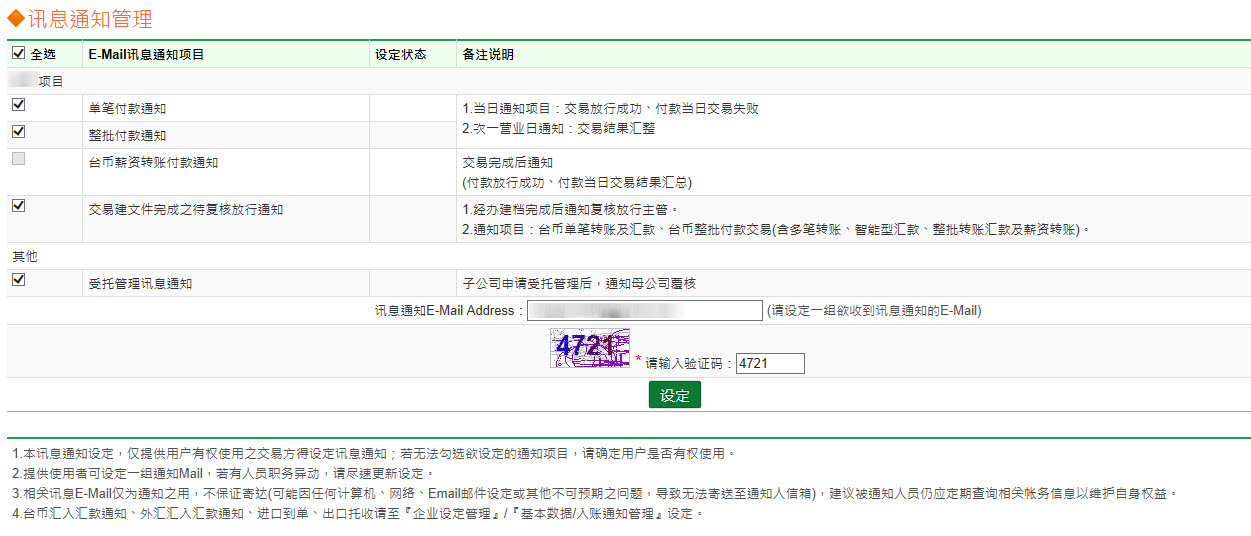 点选【管理设定】→点选【讯息通知管理】→勾选【全选】,并输入e-mail及验证码→点选【设定】
