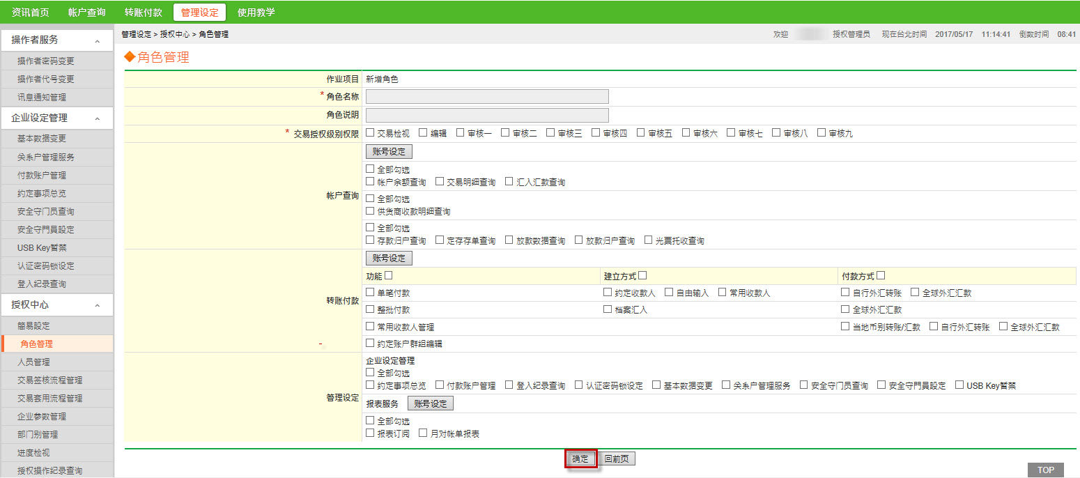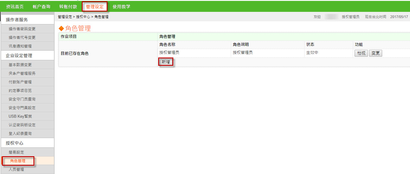 点选【管理设定】→点选【角色管理】,设定其他使用者之角色→勾选【新增】